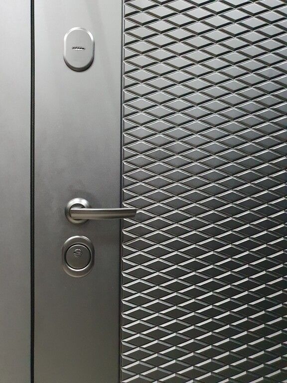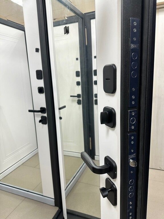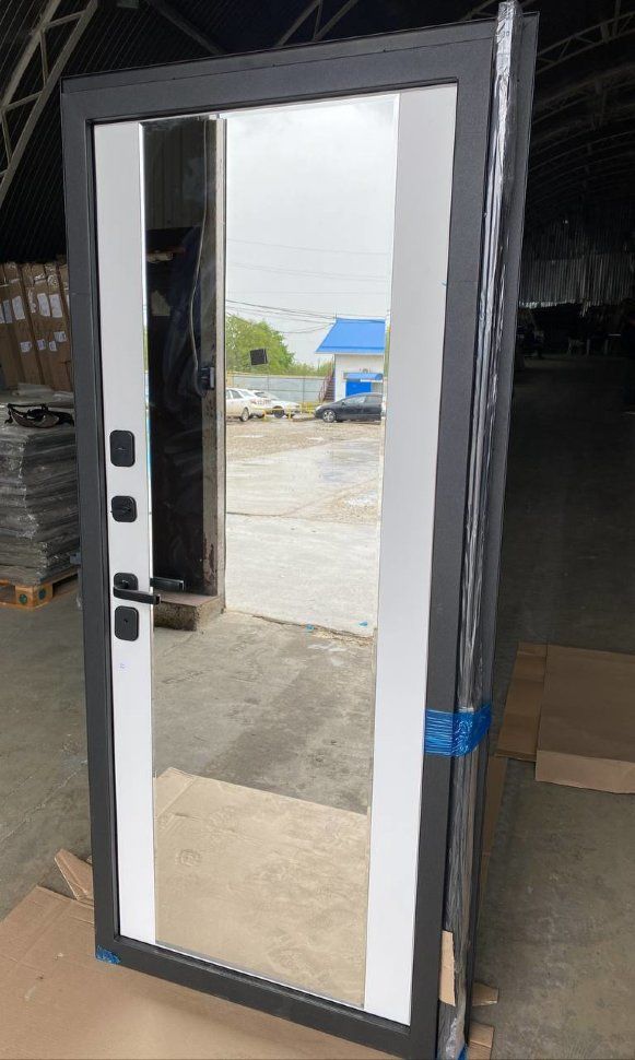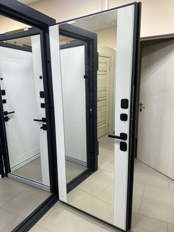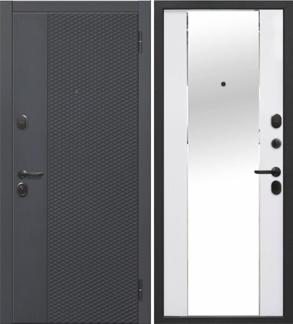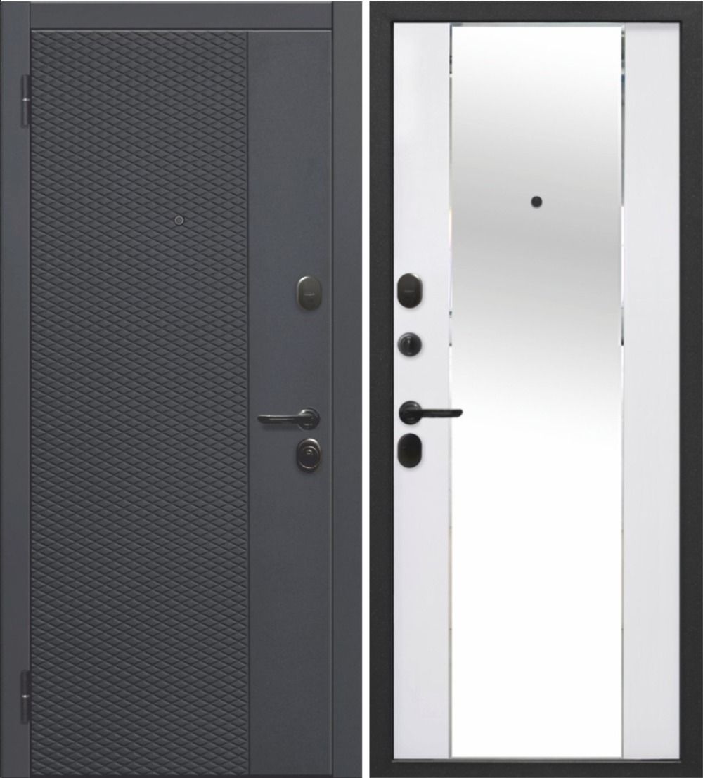 Входная дверь 7,5 см Флорида черный кварц - фрезерованная МДФ панель, цвет - эмалит белый, накладное зеркало с фацетом с защитной плёнкой — купить в Иркутске по цене 27 900 руб. — RosDoor (Сталь-сервис)