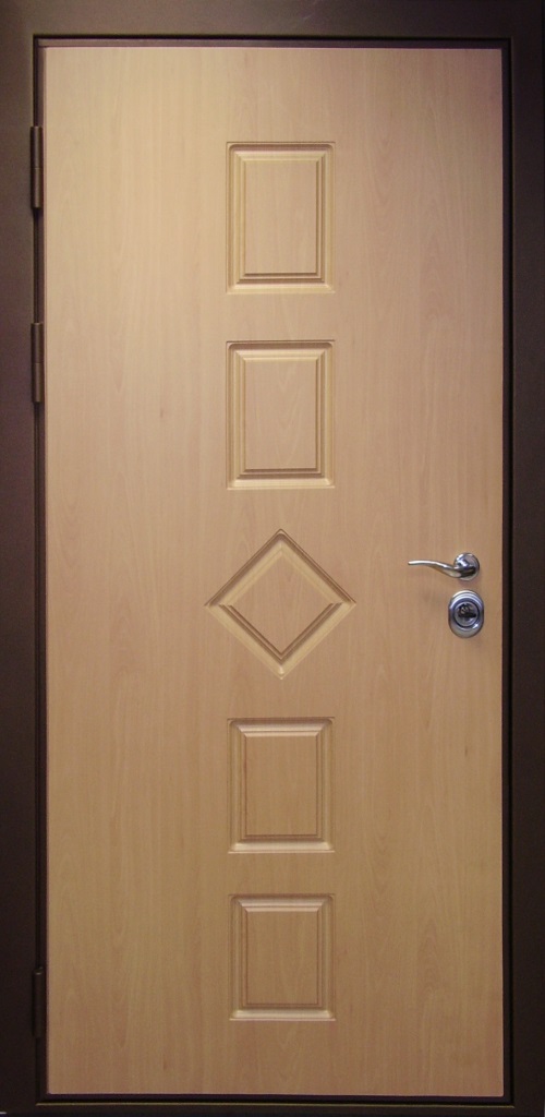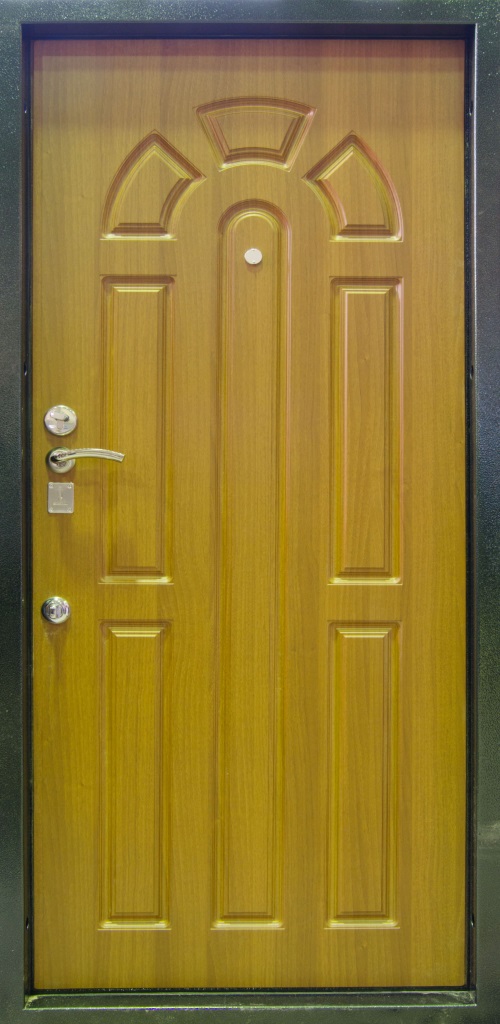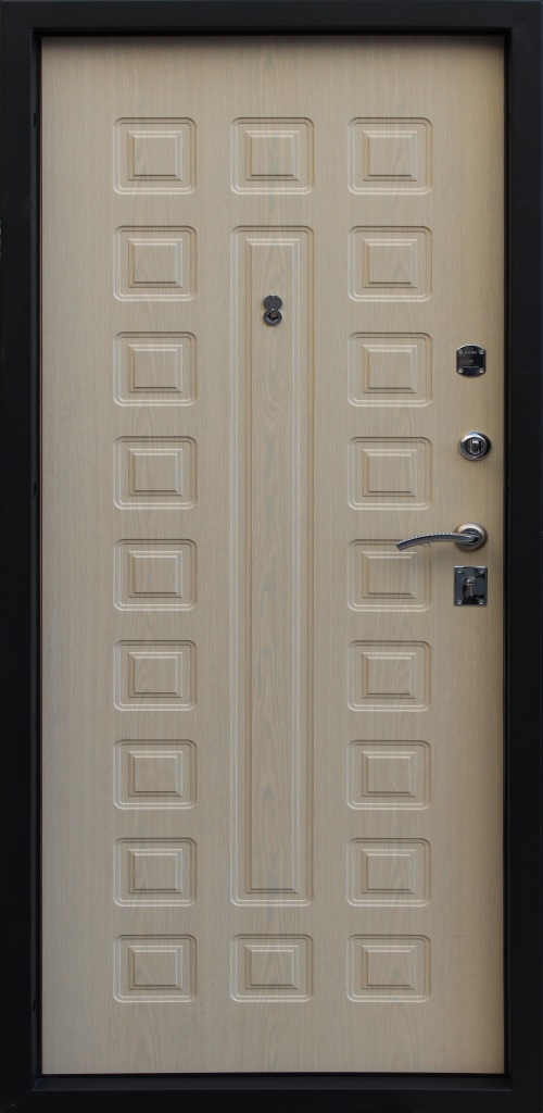 • Стальной кожух для защиты замка - в полотне и ригелей - в коробе, противосъемные ригели (защита от спиливания петель), ребра жесткости (два вертикальных и три горизонтальных).