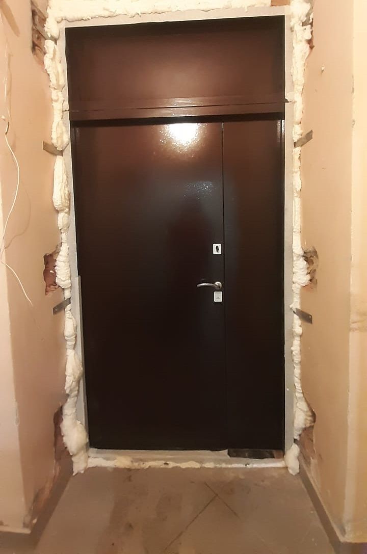 Двухстворчатая высокая уличная дверь с фрамугой, нажимная ручка (металл-металл) фото 4