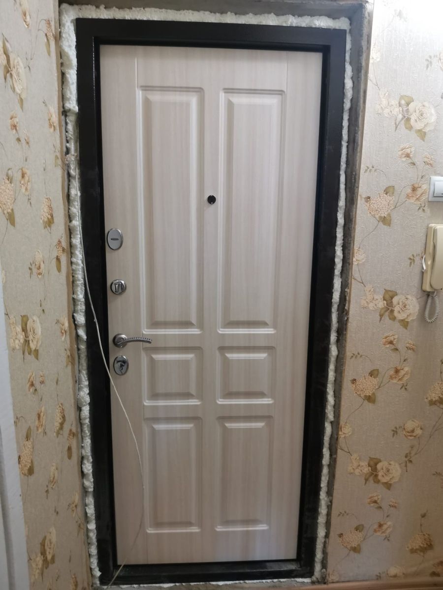 • Коробка двери объединена с широким фигурным наличником (перекрывает зазор 55 мм!), представляет собой цельноформованный профиль со специальным гибом жесткости и резиновым уплотнением по периметру (1-й контур). Материал – сталь рулонная холоднокатаная толщиной 1,2 мм. Теплозвукоизоляция осуществляется при монтаже (утеплитель поставляется в комплекте);